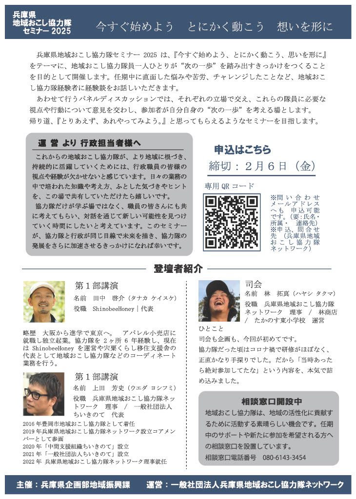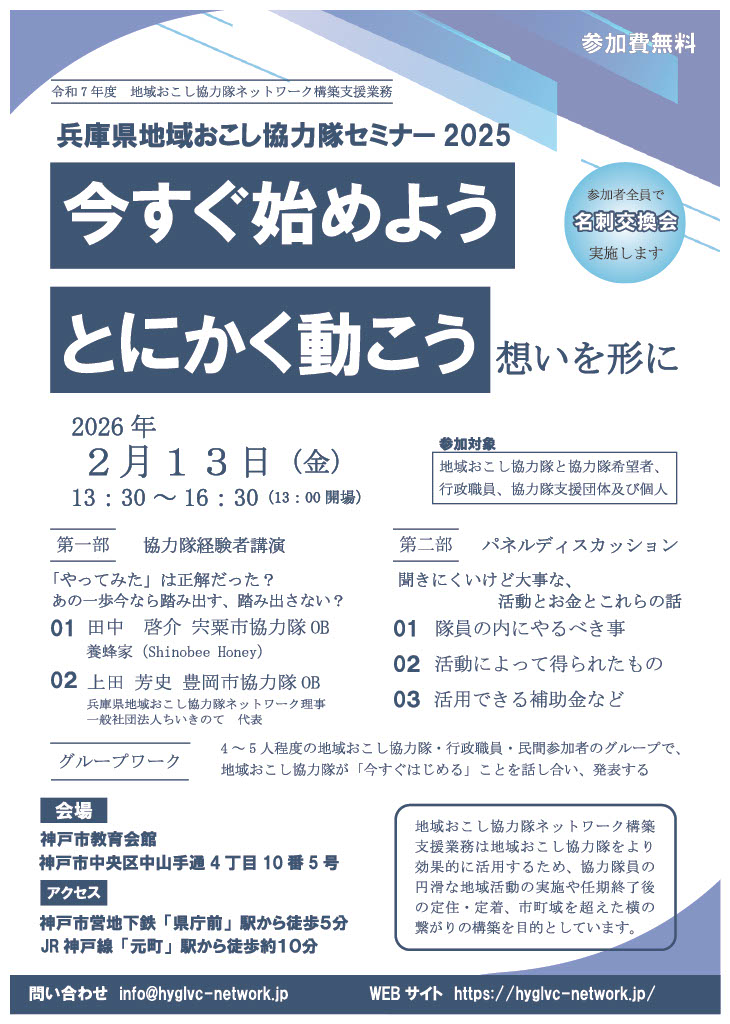 「兵庫県地域おこし協力隊セミナー2025~今すぐ始めよう とにかく動こう 想いを形に~」のお知らせ お知らせ(地域おこし協力隊・地域活性化関連)」 2026/1/6 兵庫県地域おこし協力隊ネットワークが運営するセミナーのお知らせです。元宍粟市地域おこし協力隊の林拓真理事が「自分が地域おこし協力隊のときにあったら、絶対参加した」という内容を初めての企画担当として実施します。ぜひご参加ください。 日時:2026年2月13日金曜日 13:30~16:30(13:00開場)会場:神戸市教育会館(兵庫県神戸市中央区中山手通4丁目10番5号) 参加のお申込みは、下記のボタンからよろしくお願いいたします。 参加申込みフォーム